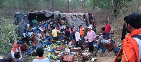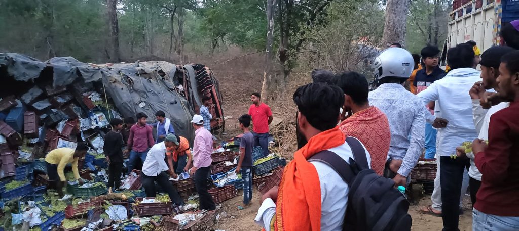 महाराष्ट्र आ रहे अंगूर से लदा ट्रक अनियंत्रित होकर गिरा गिरा गद्दा में बाल बाल बचे लोग।